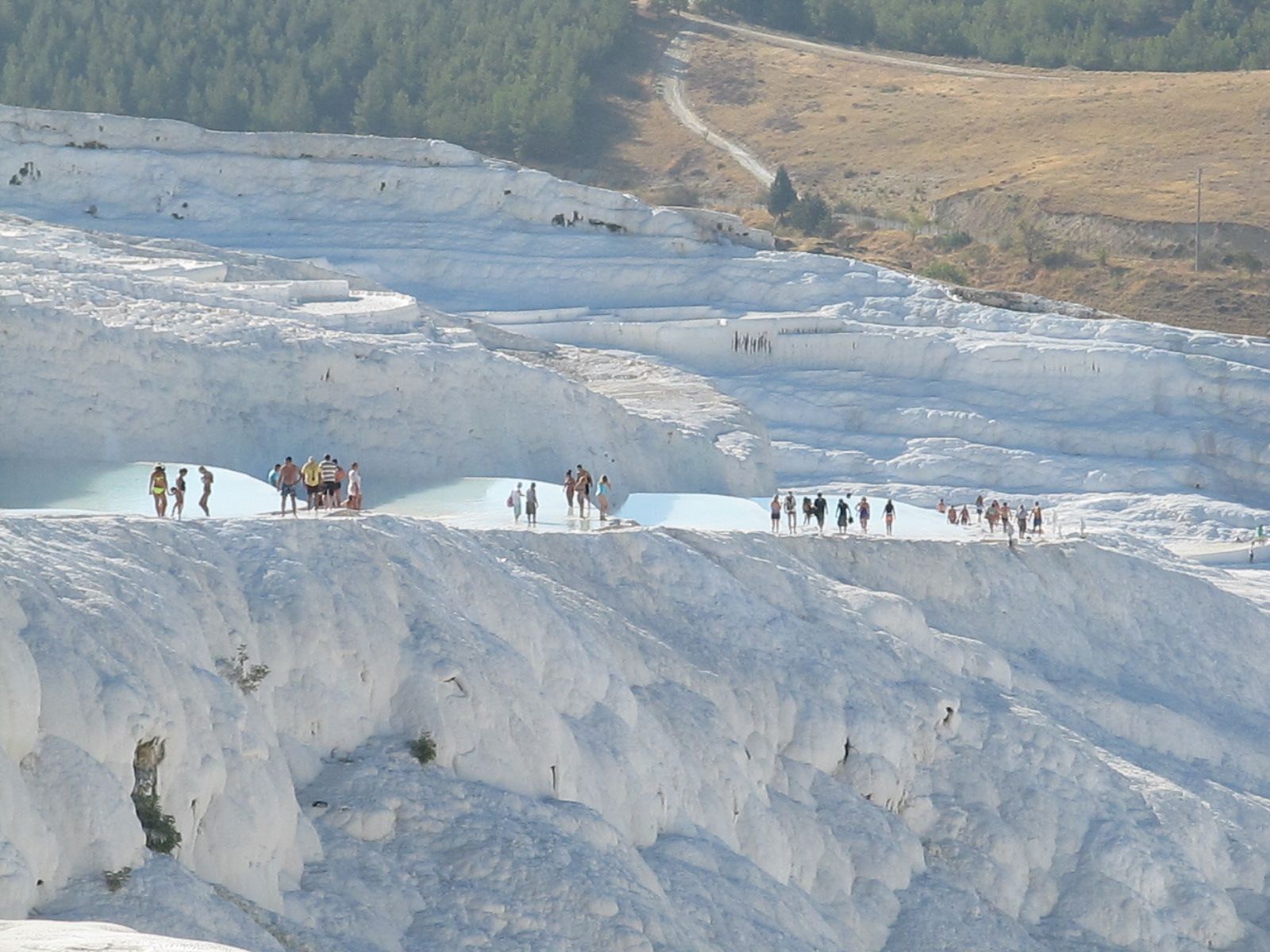 Os espetaculares terraços de travertino em Pamukkale, perto de Hierápolis, constituem uma das atrações mais populares e fotografas da Turquia. Os terraços se formam quando a água de fontes termais perdem dióxido de carbono, conforme descem a encosta, o que deixa depósitos de calcário. As camadas de carbonato de cálcio branco, depositadas em degraus sobre o desnível, ganharam o nome de Pamukkale (castelo de algodão). Para protegê-la, a área dos terraços é fechada a visitantes.